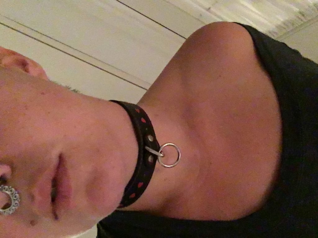 I browsed through a number of collars and this one caught my eye. I was in love. Sent pictures to my Master and he thankfully approved of my choice. I couldn’t wait to put it on when I got home and take some photos just for him. I did and they were well recieved to say the least.